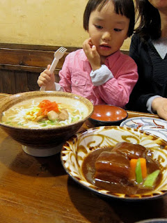 店の前でメニューを見ていると元気なおかみさんにおすすめ料理を案内されました。 ラフテーとフーチャンプルが人気メニューだそう。我々はラフテーとグルクンの唐揚げと沖縄そばをオーダー。